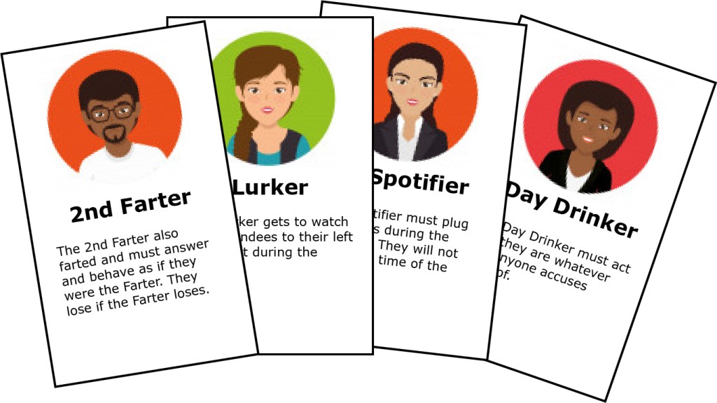 Below are some preliminary renderings of roles that might make it into the playtest version of “Zumfärter”, which will be a hidden identity game involving players taking clandestine actions while a presenter drones on. Meanwhile, the Management, IT, Slacker and Farter factions scheme to give each other the blame for a business meeting gone awry.
